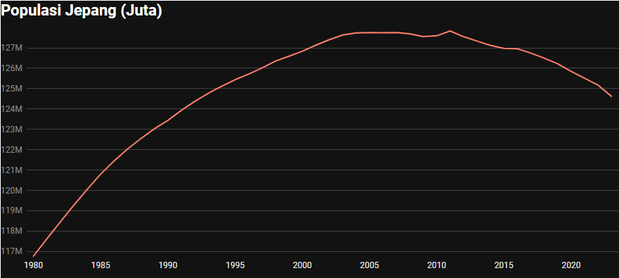 Selain bergelut dengan rasio anak, Jepang juga menghadapi persoalan besar dalam populasi secara keseluruhan. Institut Riset Kependudukan dan Jaminan Sosial Nasional Jepang, pada April 2023 mengatakan populasi Jepang akan turun di bawah 100 juta pada tahun 2056.