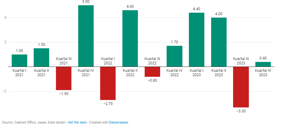 Ekonomi Jepang hanya tumbuh 0,4% pada Oktober-Desember 2023 setelah sempat terkontraksi 3,2% pada Juli-September 2023.